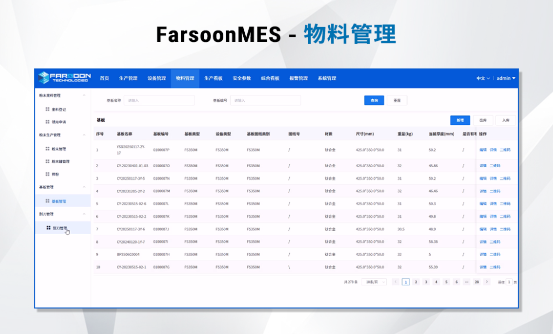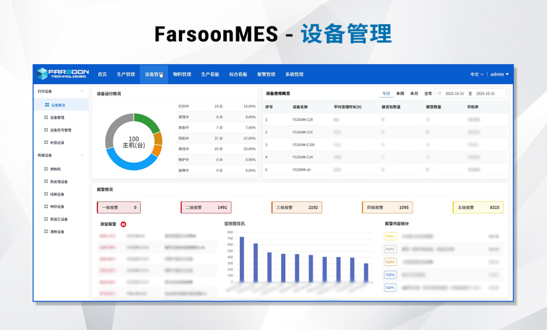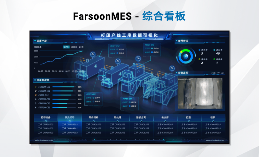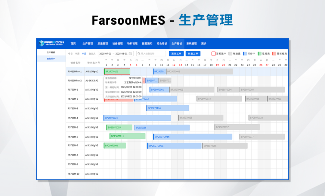 在增材制造行业迈入批产的关键阶段,生产效率、质量管控与流程透明化成为企业核心竞争力。华曙高科聚焦行业痛点,打造核心功能突出的MES系统(Farsoon Manufacturing Execution System),涵盖生产管理、质量管理、物料管理、设备管理、报警管理、安全参数监测六大模块,可实现1人同时管理12台设备,覆盖生产全流程关键环节,人工成本降低70%,为企业提供高效、精准的数字化解决方案,推动增材制造批产迈向“透明化、智能化”新阶段。